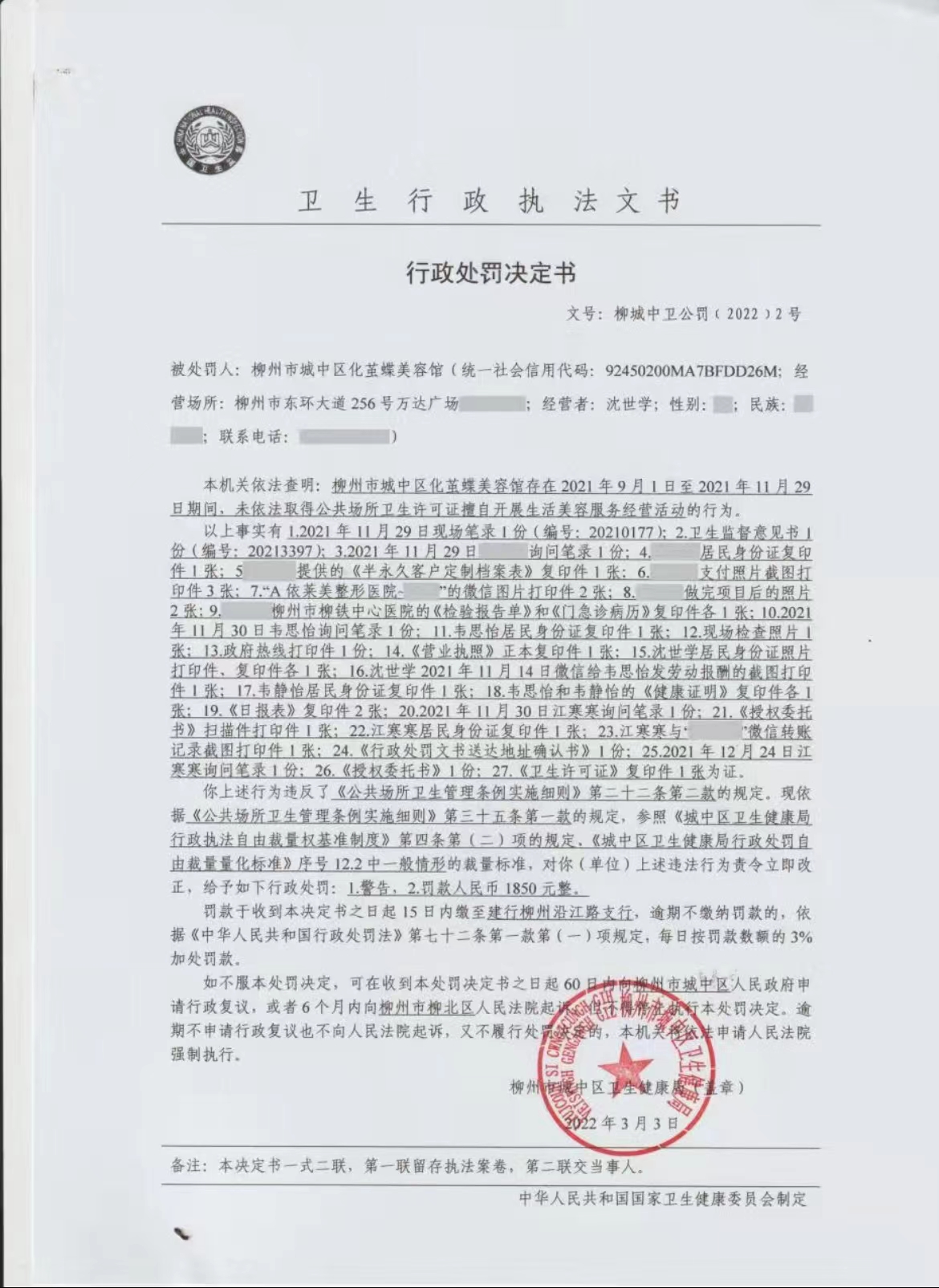【卫健局】行政处罚决定书(柳城中卫公罚〔2025〕1号)