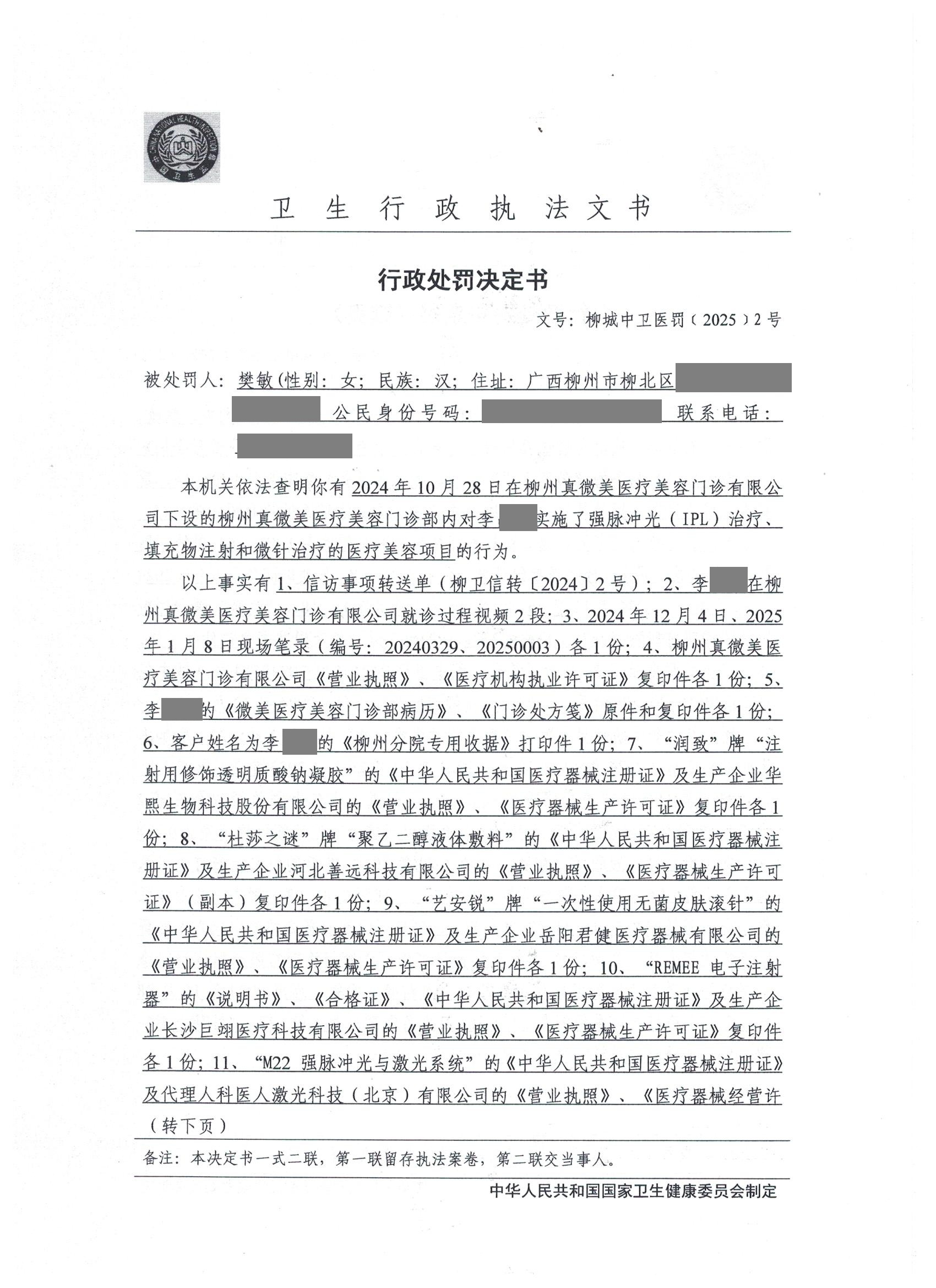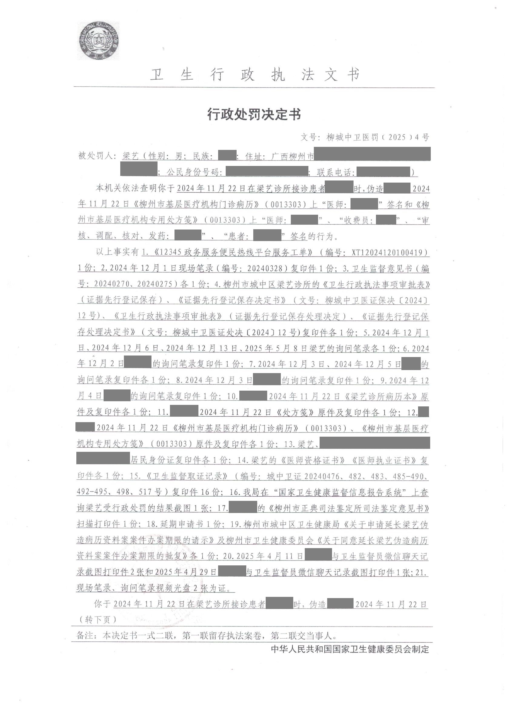 【卫健局】行政处罚决定书(柳城中卫职罚〔2025〕1号)