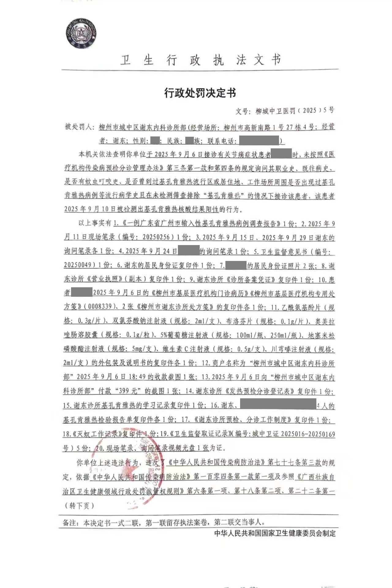 【卫健局】行政处罚决定书(柳城中卫医罚〔2025〕5号)
