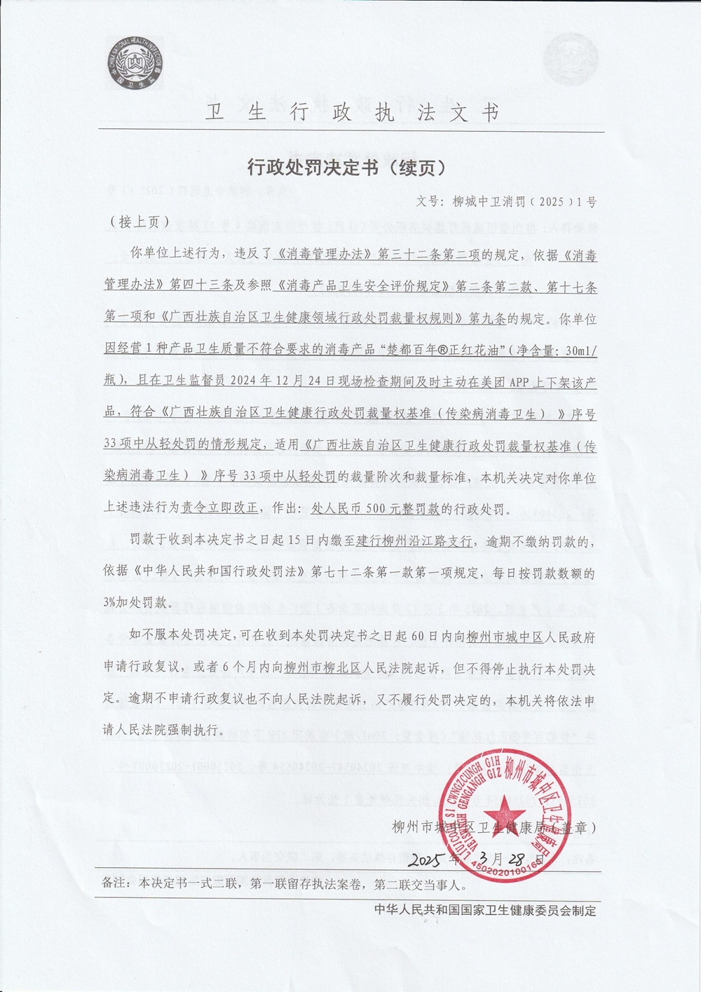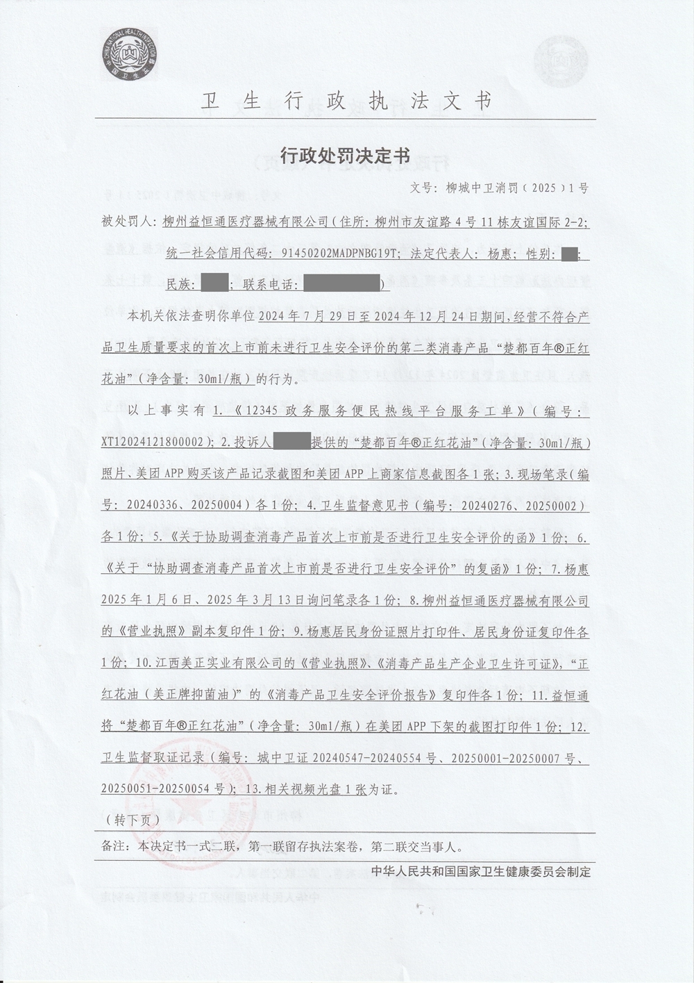 【卫健局】行政处罚决定书(柳城中卫消罚〔2025〕1号)