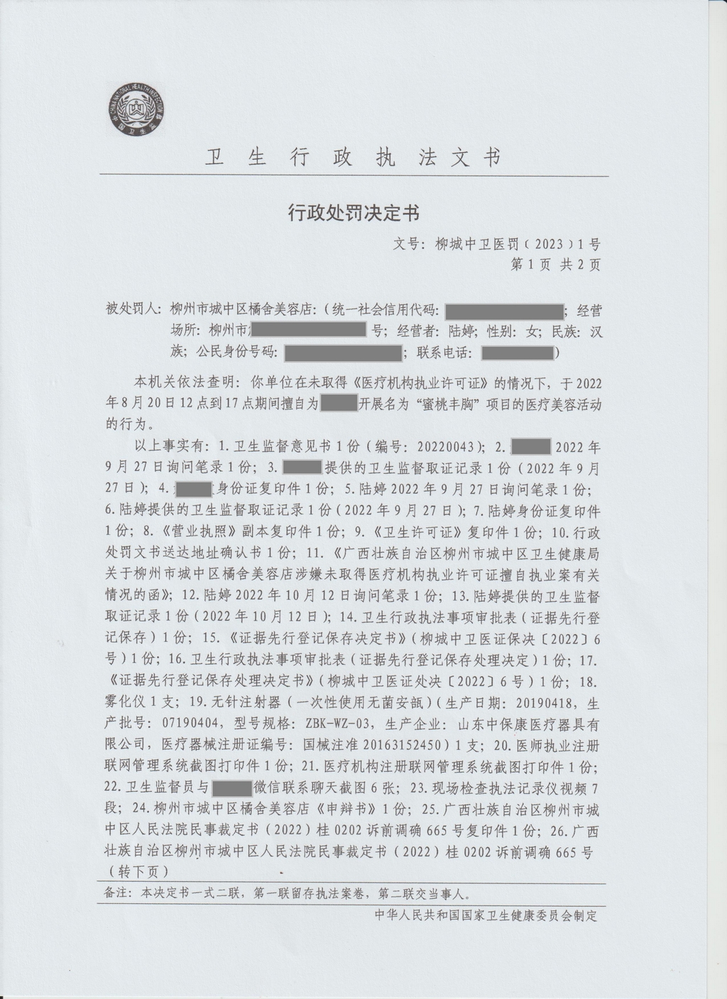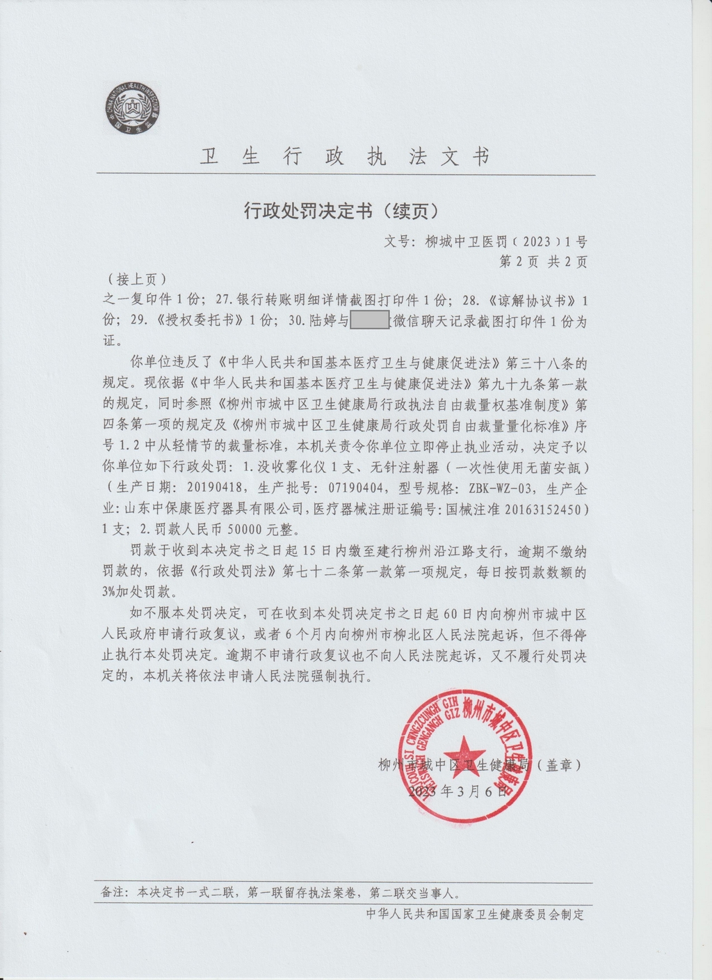 【卫健局】行政处罚决定书(柳城中卫医罚[2023]1号)