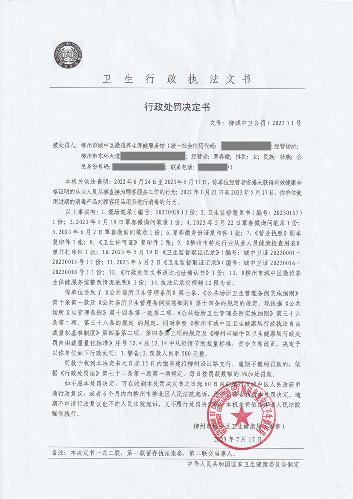 【卫健局】行政处罚决定书(柳城中卫公罚[2023]1号)
