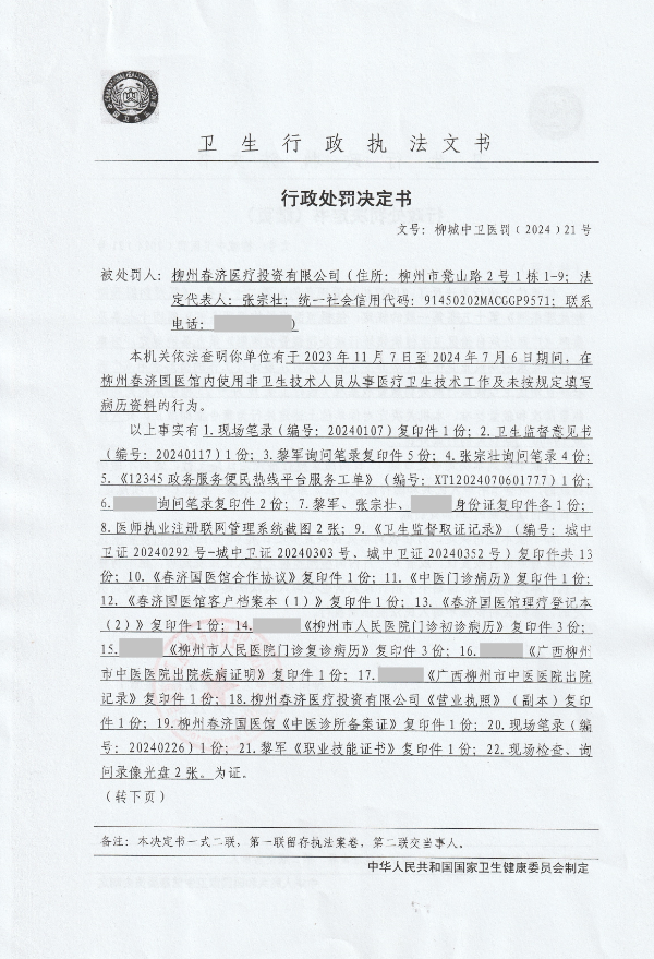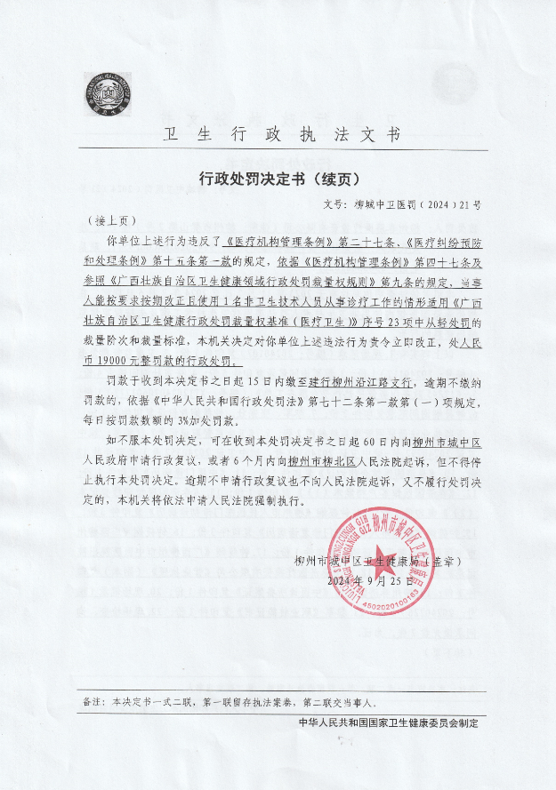 【卫健局】行政处罚决定书(柳城中卫医罚[2024]21号)