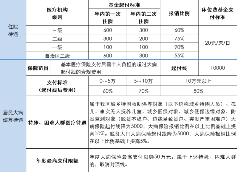 目前,广西城乡居民医保的基本医疗(医保目录范围内费用)统筹支付最高限额为(每年1月1日前)最新公布的广西城镇居民可支配收入的6倍,即:2022年度居民医保的年度统筹报销额度是21.5万元(包含因患癌症等重特大疾病需要使用费用较高的特药,在医保定点药店购买特药发生的费用);城乡居民大病保险(医保目录范围内个人支付部分)年度支付限额是50万元(特殊困难群众居民大病报销不设上限)。