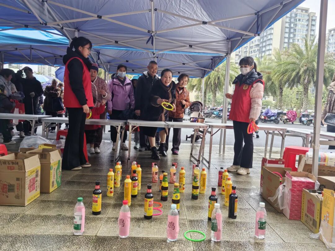 活动现场暖意融融、精彩纷呈,各类趣味十足的活动项目吸引了男女老少村民踊跃参与、驻足体验。其中,趣味套鸡区无疑是全场的焦点,现场人气爆棚、热闹非凡。“中了!终于中了,今晚家里能添一道硬菜啦!”村民兰大姐手持套中的“战利品”,脸上洋溢着幸福的笑容,满心欢喜地与身旁的村民分享这份收获的喜悦。射箭投壶区前,村民们有序列队、各展身手,凝神瞄准、相互鼓劲;幸运大转盘区人头攒动,大家满怀期待转动转盘,阵阵欢呼与喝彩声不绝于耳;欢乐滚滚区里,大人小孩携手参与,滚轮滚动声与欢快笑声交织,一次次将现场氛围推向高潮。