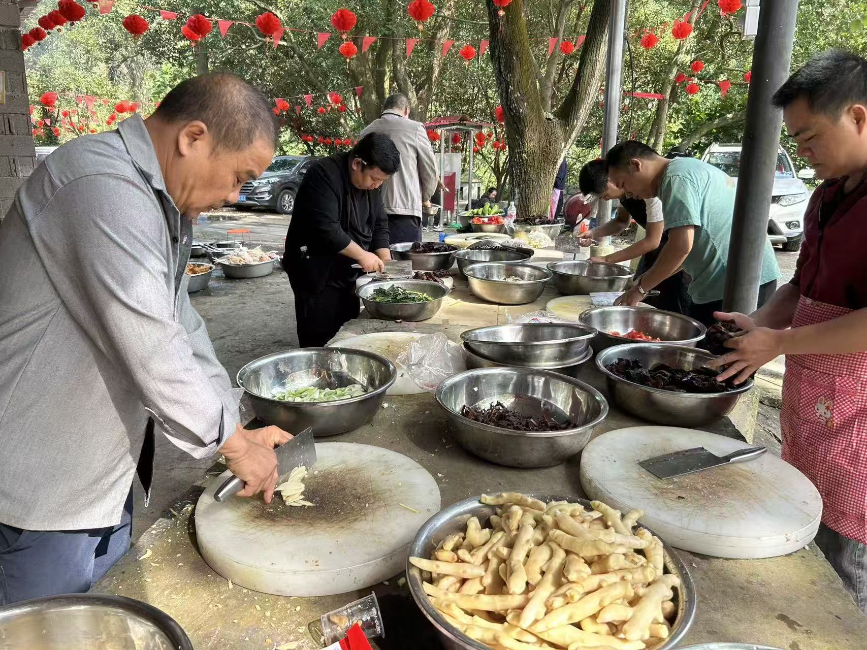 活动当日,潭冲屯文化广场上欢声笑语,其乐融融。村文艺队队员们精神满满,满怀激情,为现场老年人带来了形式多样、内容丰富的文艺节目。孝老敬老的歌舞节目,唤起了老一辈的共同记忆,赢得了大家的阵阵掌声与喝彩。队里的队干、志愿者齐聚一堂,洗菜、切配、烹饪,装盘,他们在社王的厨房里忙碌不停,干劲十足,为了让老人吃得开心、吃得健康,他们精心为老年人设计了菜品。