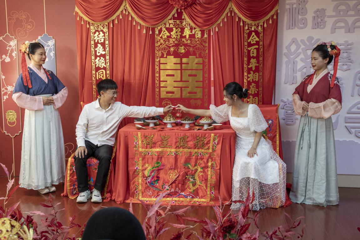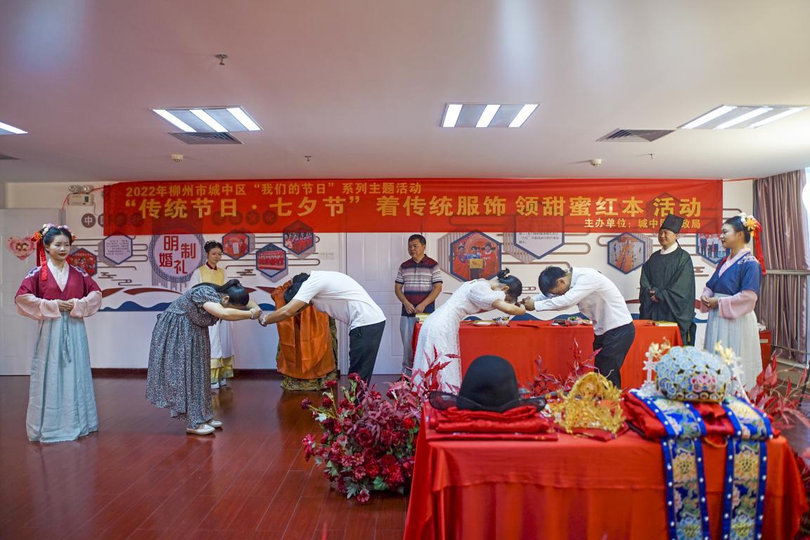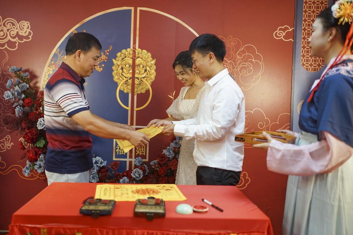 城中区作为第二批全国婚俗改革实验区之一,在传承和倡导文明婚俗中不断推陈出新,在当天为新人开展“传统节日,七夕节”着传统服饰,领甜蜜红本的特色颁证活动。新人行夫妻对拜礼仪、行沃盥礼、签署《鸳鸯礼书》、颁发中华人民共和国结婚证、参与传统手作拓印家风家训双喜贴、吃随喜糖等。城中区民政局副局长郑蔼新、市婚登中心主任许静为新人赠送家风家训书籍。