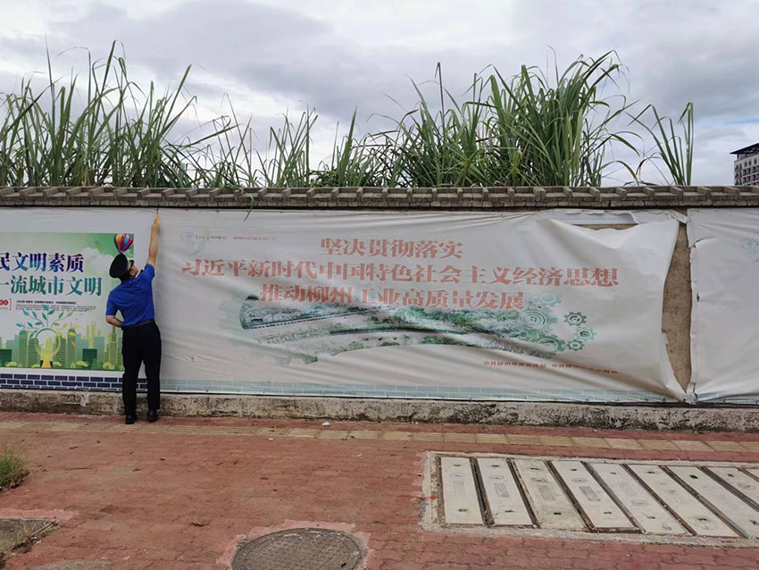 图为执法人员清除破损广告