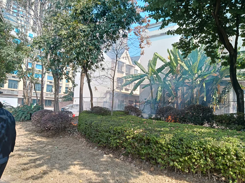 在东祥福苑小区西门附近一块桂中大道延长线和小区围墙之间的空地上,执法人员找到起火的地点。空地上铺满落叶,四五个起火点正在燃烧。其中位于小区围墙内绿化带的两处火点火势尤为猛烈,火苗蹿起有半米多高,绿化灌木燃烧时不断发出“噼里啪啦”的声响,现场浓烟滚滚,灰尘四散,气味呛鼻。