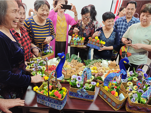 活动伊始,专业编篮老师来到现场,有条不紊地为居民讲解编篮的基本技巧与方法,并结合实际操作演示,让居民们能够快速理解要点。居民们神情专注,学习热情高涨。随后进入实践环节,大家纷纷拿起藤条,按照所学开始动手编织。过程中,邻里间相互交流心得、彼此协助,展现出良好的互助氛围。经过一番努力,一个个各具特色的精美花篮相继完成,居民们手捧自己的劳动成果,脸上洋溢着满足与自豪的笑容。