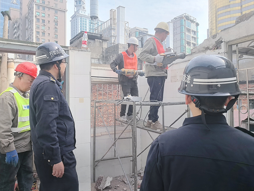 随后,城中区综合行政执法局制定了拆除计划,并于3月20日一早开始行动。由于拆除的是加建部分,不能破坏原有的合法楼层,城管部门采取了全手工拆除的方式。