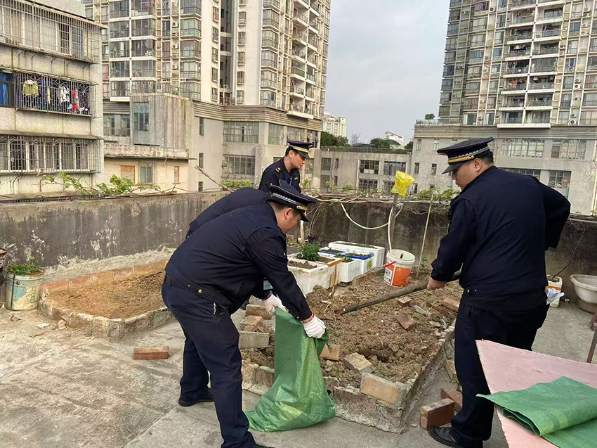 第二天,执法人员和社区工作人员携带工具赶到小区对这处“空中菜园”进行清理,当事业主也主动帮忙。经过众人2小时左右的努力,菜地被清理完毕。