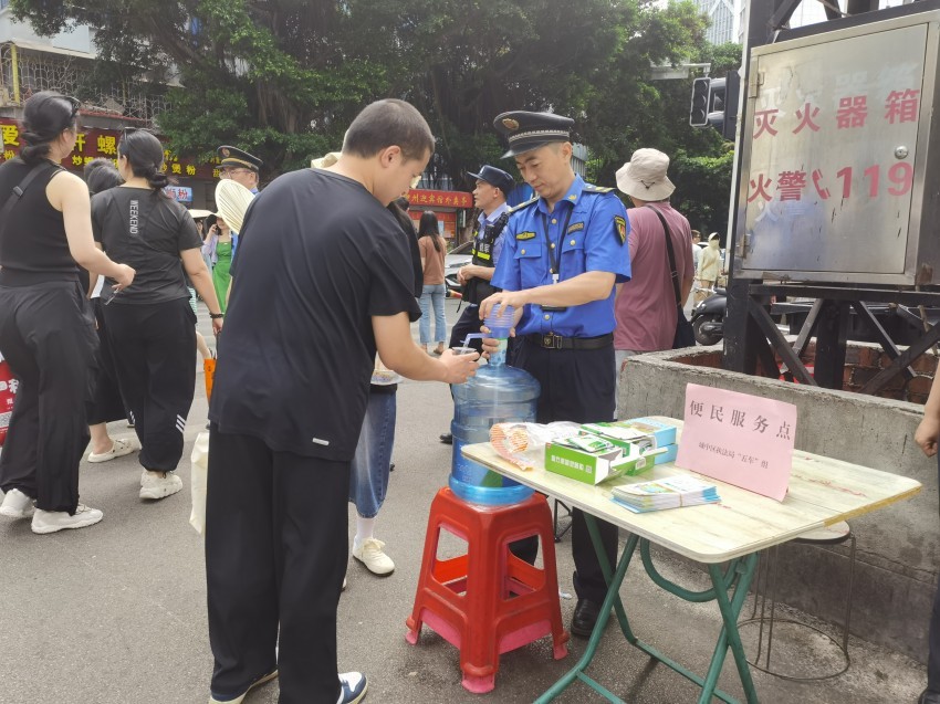 (城中区执法局讯 通讯员邓湖广报道)五一期间的青云市场入口处,一个由摆着桶装水、金银花茶、防暑药物、创口贴等物品的小方桌,几名身穿天蓝色制服的“服务员”组成的便民服务点成了新的“网红点”。这个由城中区综合行政执法局设立的“网红便民服务点”以免费的清水、私人定制的柳州景点攻略为“主打产品”,日均接待服务市民游400余人,收获了无数点赞。也让许多游客表示“来柳州的第一站就在这里感受到了柳州人的热情。”