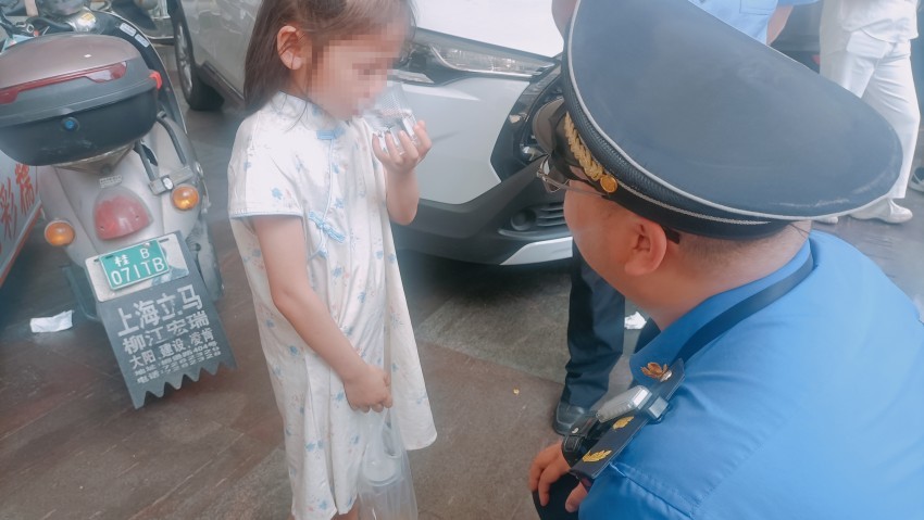 接到阿婆的求助后,执法队员赵勇强立即赶往现场。在彩票店的门前,一个五六岁的小女孩正独自啜泣。面对执法人员的轻声安抚,孩子因紧张始终无法说出有效信息。眼见沟通无果,赵勇强当机立断拨打了110报警电话说明情况。