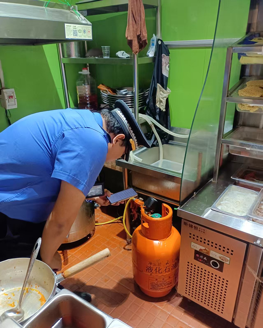 “切断阀一定要保持在正常工作状态。”在曙光中路的一家餐饮店面检查时,执法人员发现店内一个燃气瓶上安装的切断阀电池耗尽,处于关闭状态,执法人员当即提醒店主立即整改。此外,执法人员还对店内燃气来源、燃气使用器材(钢瓶、炉具)是否合格、输气胶管是否老化腐蚀等隐患点位逐一排查,对发现的问题详细记录,并责令当事店面立即整改,确保隐患不过夜。