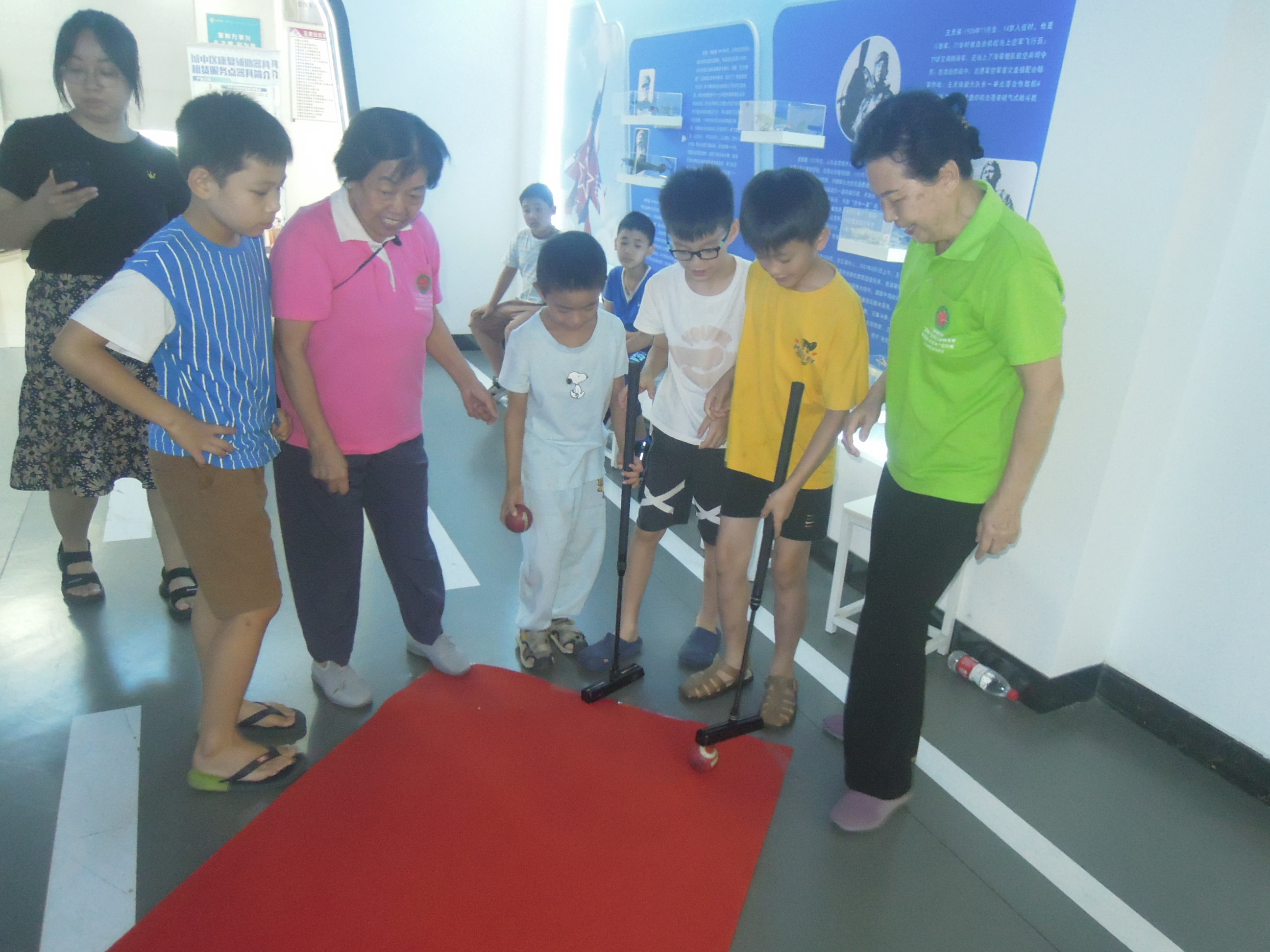 在门球体验区,孩子们在老队员黄永红、范苏云、崔颖等指导下接触门球运动。教练耐心示范、手把手传授握杆、瞄准、击球等打门球技巧,孩子们兴趣盎然手持球杆练习击球进门,活动现场氛围轻松热烈。