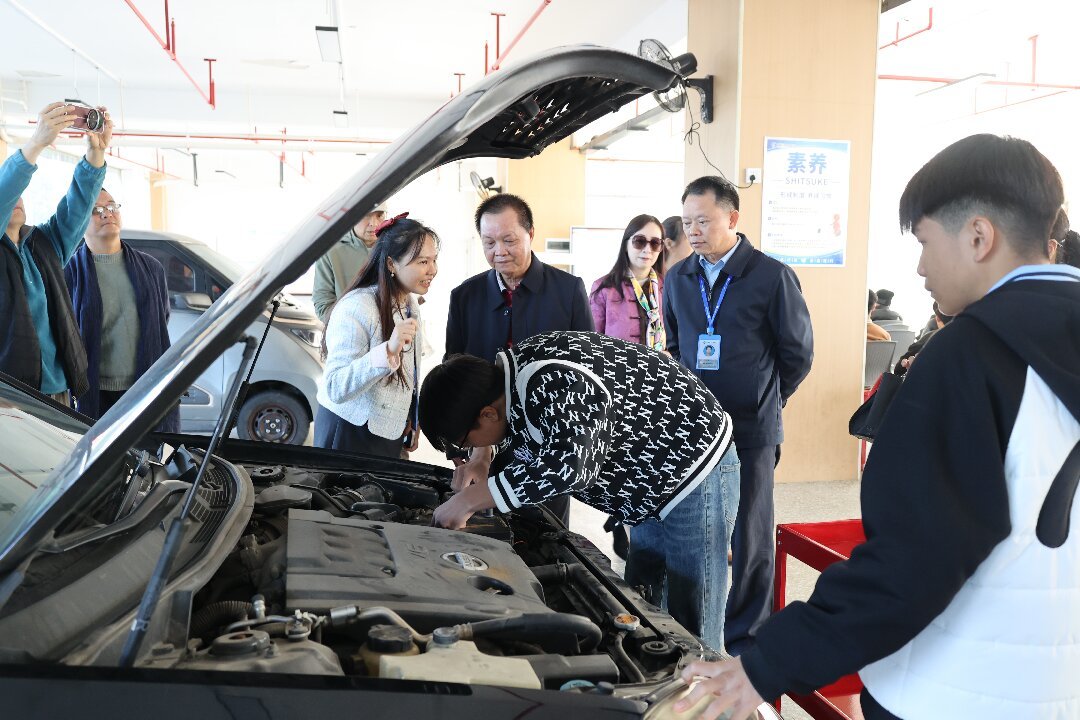 循着琅琅书声与器械实操的声响,学习组在该校党委罗书记及校方老师的引领下,深入新能源汽车科技实训室。实训室内,电池管理系统训练平台、动力总成拆装实训台等专业设备整齐排列,两个班上百名学子正全情投入“理论研讨+实操演练”的沉浸式课程。他们专注的眼眸紧盯操作细节,精准完成动力电池检测、电机驱动系统调试等实操环节,尽显新时代技能学子的活力与风采,让在场观摩的老科技工作者频频点头称赞。