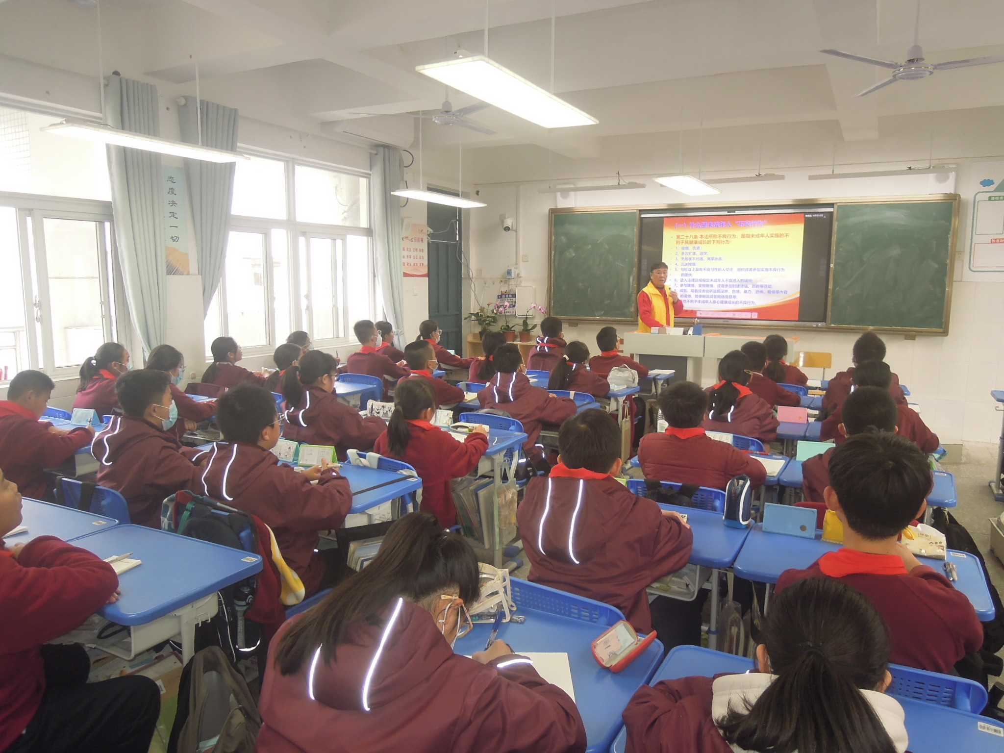 在初中一年级12个班,五老宣讲员郑永清宣讲 《宪法护佑 法伴成长》、孙委明宣讲《学法守法 从我做起》、苟中明《学法用法 防校园学生欺凌》、曾桂新《文明守法 健康成长》、彭先姣《宪法是国家的根本大法》、唐芳《宪法小课堂:我的权利“保护伞”》、李贤芳《做一个遵纪守法的小公民——学习“预防未成年人犯罪法”》、王国辉《他为什么被公安抓去坐牢?》、马岫岩《学法,守法,做合格小公民》、张晓渔《知法守法,做品行端正的好学生》、梁小玲《知法守法,做新时代好少年》、罗琦《学法懂法 做遵纪守法的好少年》。