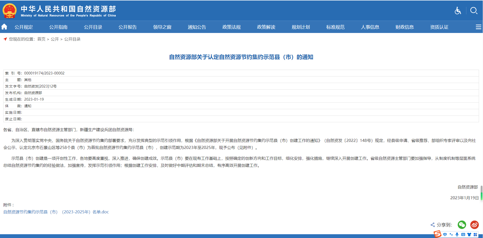 附件:1.自然资源部关于认定自然资源集约节约示范县(市)的通知网站截图