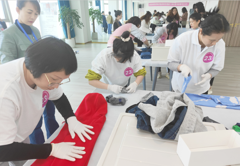 在活动现场,收纳整理指导老师先分享了生活理念和生活态度,随后就收纳整理的理论及收纳的空间布局、收纳工具的合理利用、衣物的折叠方法进行了讲解和实操培训。 培训结束,接着进行了收纳整理技能竞赛。来自各企事业单位的30支女职工代表队,分成6个组,每组5个代表队进行比赛,各队队员立即将刚刚所学付诸实践,开启“指尖对决”。城中区总工会女职工代表队分工协作,快速整理,分类折叠,在规定时间完成收纳整理。专业评委对每个参赛队进行评分,比赛取平均分,根据分数高低进行排序评出一、二、三等奖共20支队。最终,城中区总工会女职工代表队以优异的成绩荣获一等奖。