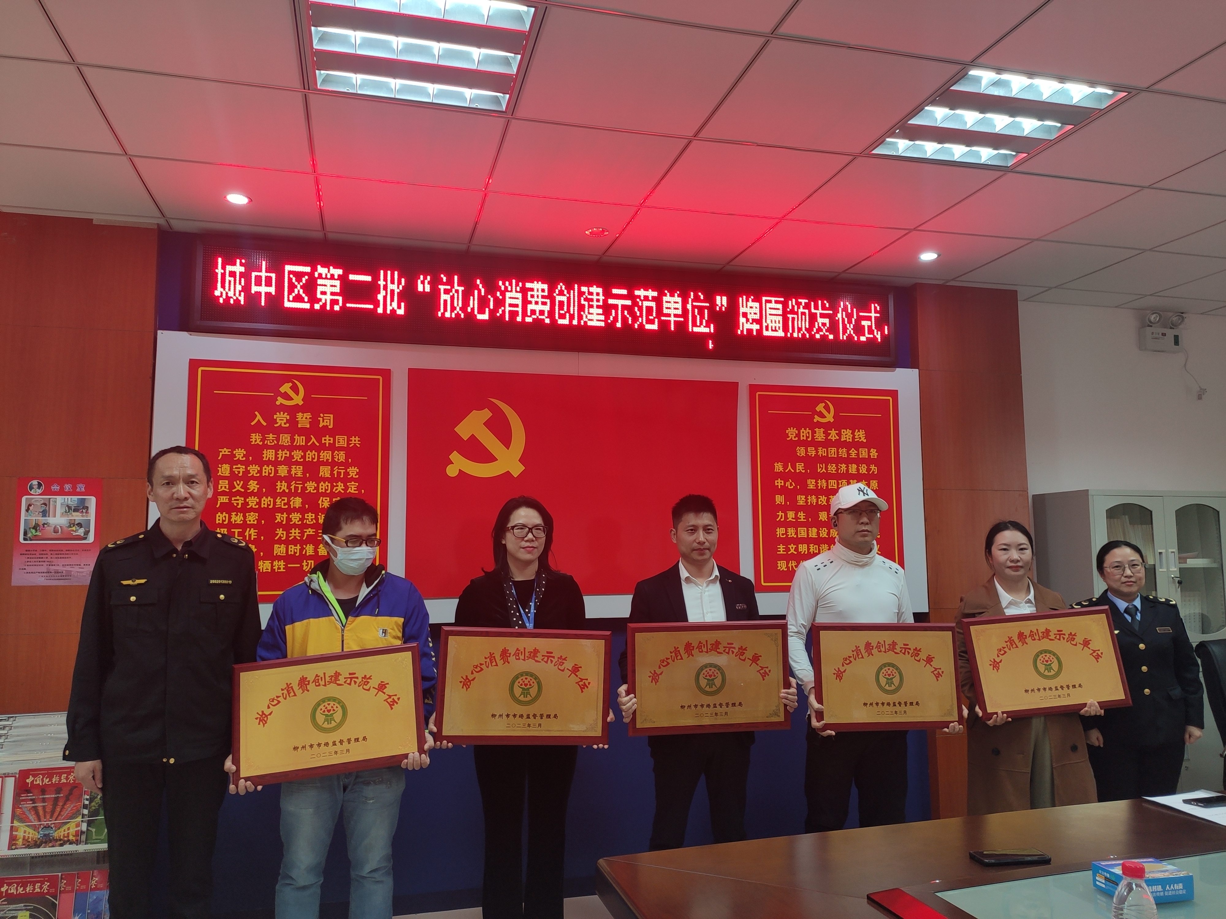 会上,组织获奖企业首先学习了柳州市市场监督管理局办公室印发的关于《柳州市线下无理由退货工作指引》的文件,提高企业责任感。随后向城中区第二批“放心消费创建示范单位”的获奖企业:城中区东篱田居美食坊、城中区东都百货有限责任公司、广西花椒传媒集团有限公司、万达广场商业物业管理有限公司、一禾广告策划有限责任公司、广西联华超市股份有限公司解放店6家企业的代表,颁发了荣誉奖牌。