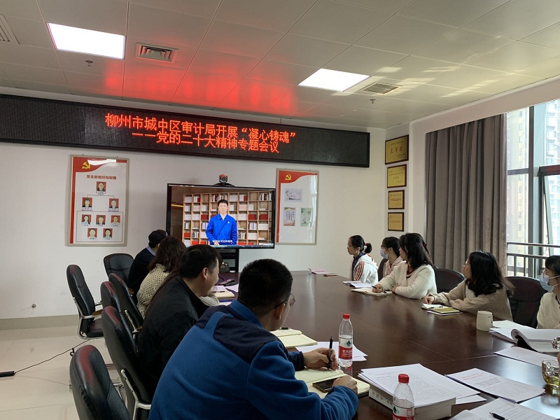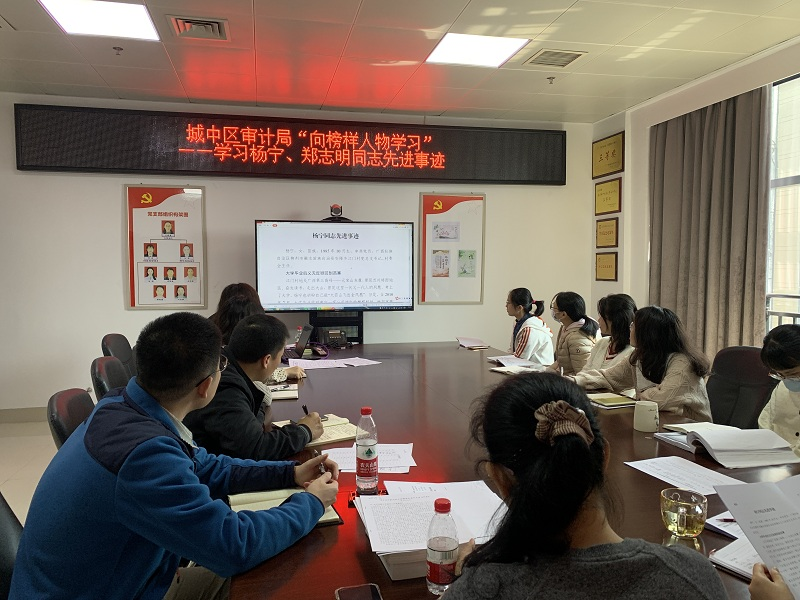 图1:城中区审计局党支部书记王晓泉同志带领大家共同学习杨宁、郑志明同志的先进事迹