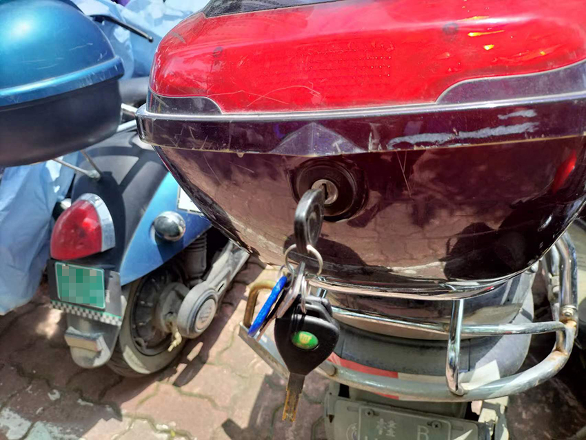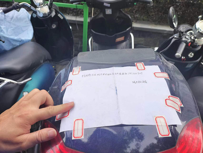 当天下午1点左右,城管队员在清和路巡查时,看到人行道上有一辆电动车线外违停,然而附近无人。在城管队员上前将车移进停车线内过程中,发现电车的尾箱上还挂着一串钥匙。为避免车主车辆被盗损失财物,城管队员打算在原地等车主。然而半个多小时都未见有人返回寻找钥匙,又接到智慧城管平台新转派投诉案件,城管队员只好带走钥匙,手写了一张带有电话的便条张贴在电车尾箱上。