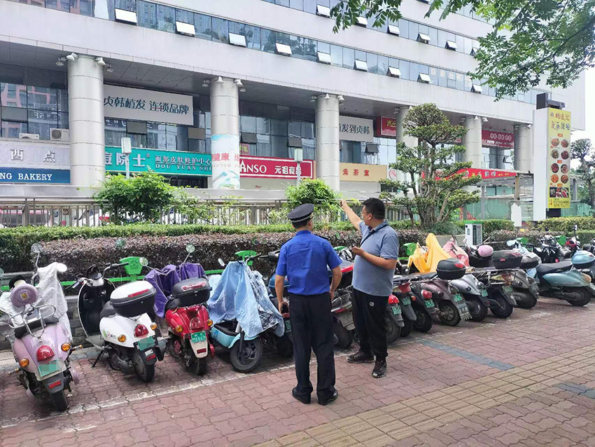 (城中区执法局讯 通讯员邓湖广报道)5月16日,城中区城管执法局城管队员在清和路阳光100广场附近巡查时,发现人行道上有辆电动车违停,车尾箱还挂着钥匙。城管队员将车移到线内后,把车钥匙取下帮忙保管。