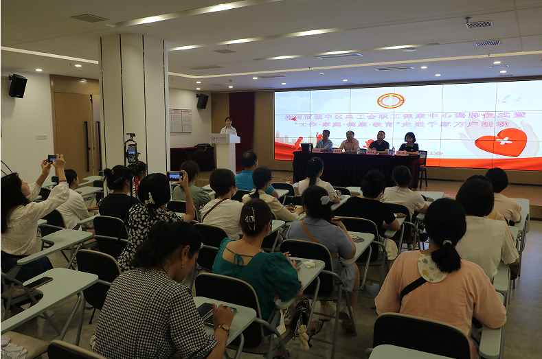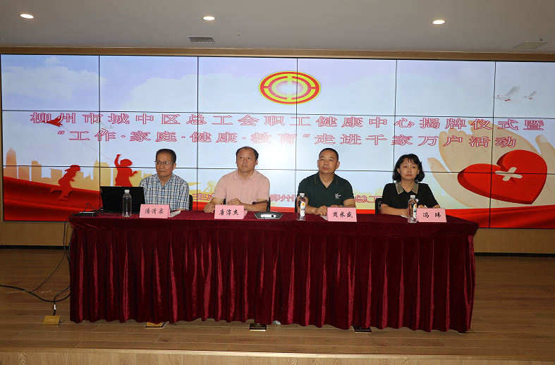 (城中区总工会讯 通讯员曾婷报道、彭景泉摄影)随着社会的高速发展,竞争的不断加剧,生活节奏的加快,学生的学习越来越倦,人们越来越感觉到压力山大,这些问题造成了很多的家庭工作的冲突,引发家庭的矛盾、职业的倦怠和幸福感和快乐感的降低。为了能够帮助广大职工更好地适应社会发展,积极调整情绪和压力、提升工作、学习和家庭生活的幸福感,柳州市城中区总工会在城中区党群服务中心建设了职工健康中心,并于5月31日举行了揭牌仪式。城中区城中区党组书记、总工会副主席唐淳杰,城中区总工会党组成员、副主席冯玮、周米盛及华中师范大学心理学博士、广西科技大学三级教授潘清泉博士参加揭牌仪式。