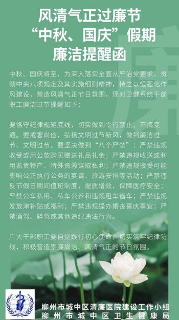 【清廉医院】柳州市城中区清廉医院建设 《风清气正过廉节“中秋、国庆”假期廉洁提醒函》