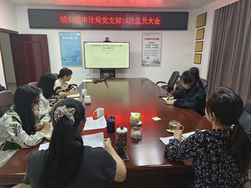 (城中区审计局讯 通讯员陈柳伊报道)10月15日,城中区审计局党支部组织开展10月党员大会,深入学习习近平总书记在庆祝全国人民代表大会成立70周年大会上的重要讲话精神、习近平总书记在庆祝中国人民政治协商会议成立75周年大会上的重要讲话精神、习近平总书记关于推进中国式现代化的重要论述等。