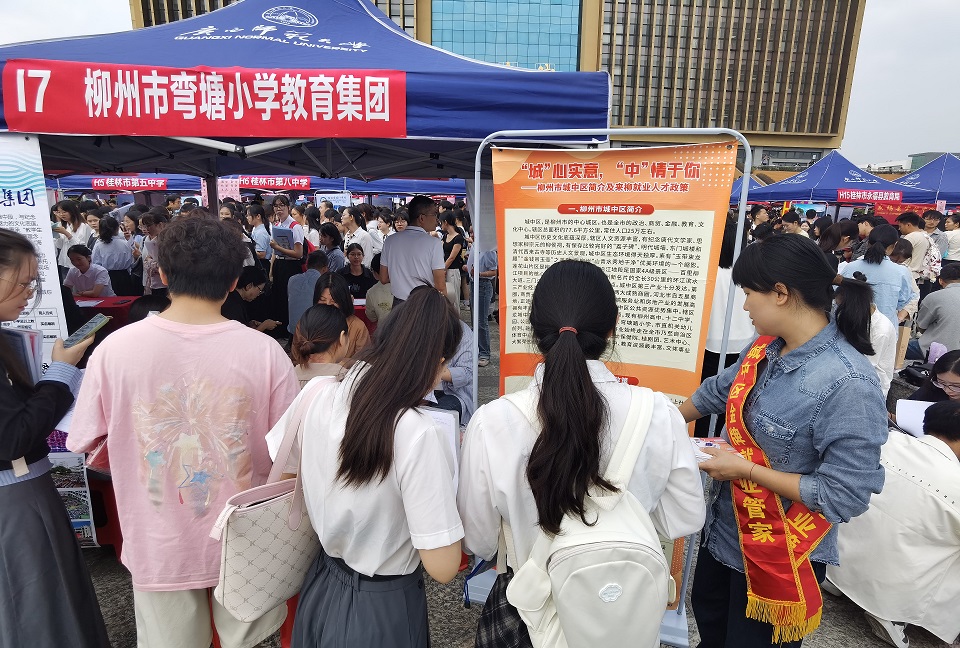 11月16日,柳州市城中区人力资源和社会保障局联合城中区教育局及12所中小学,组团赴广西师范大学(雁山校区)参加2025届师范类毕业生就业双选会(桂林专场)。当天,提供岗位51个,其中实名编制36个,聘用教师控制数15个,吸引420名高校毕业生投递简历,与47名高校毕业生初步达成签约意向。