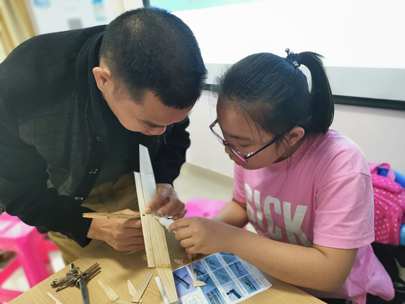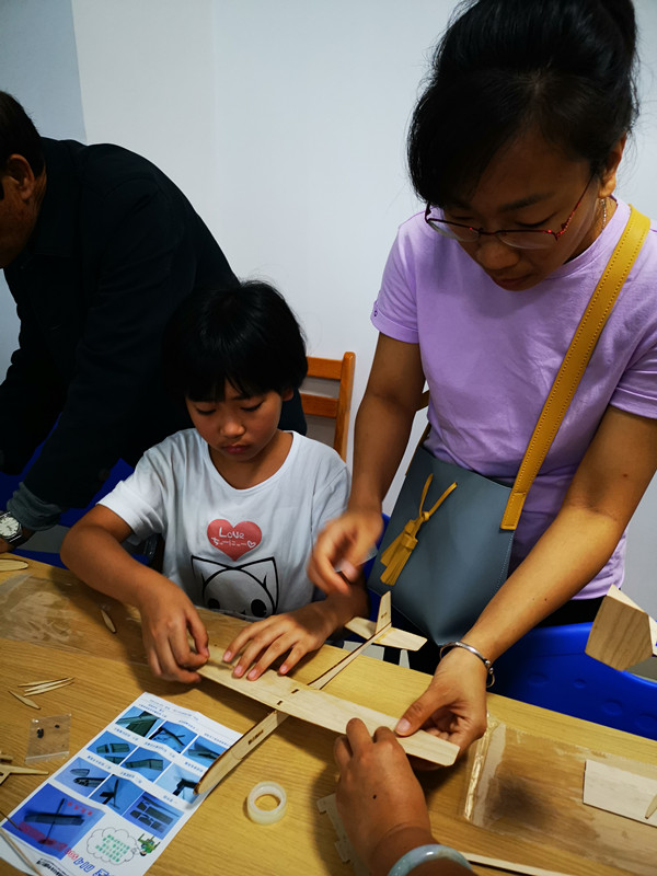在活动中,来自西北工业大学的老师给大家讲解了航空的发展、航模的飞行原理、整体构造以及乘坐飞机的相关知识和流程,鼓励大家积极培养对航天航空知识的兴趣与爱好,将来投身国家航天航空事业,为国争光。随后,大家在老师的指导下,将一个个零部件慢慢拼成了一架完整的飞机,孩子们都充满了成就感。