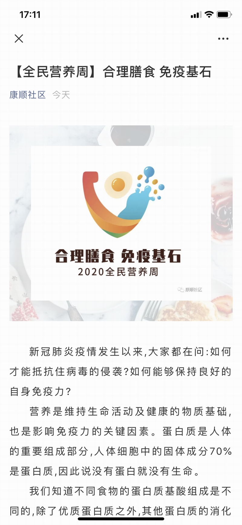 新冠肺炎疫情发生以来,大家都有这样的疑问:如何才能抵抗病毒的侵袭?如何能够保持良好的自身免疫力?康顺社区利用这个契机,在社区微信公众号设立“全民营养周”专栏,倡导科学营养,合理膳食、增强免疫、摒弃陋习、预防疾病为导向,向公众宣传健康科普知识,组织发动大家在线浏览。在社区居民信息群里展开讨论,不仅要合理膳食,还要推行“三减三健”,居民们各抒己见,共同学习。还在辖区内悬挂宣传口号,让健康理念深入人心。