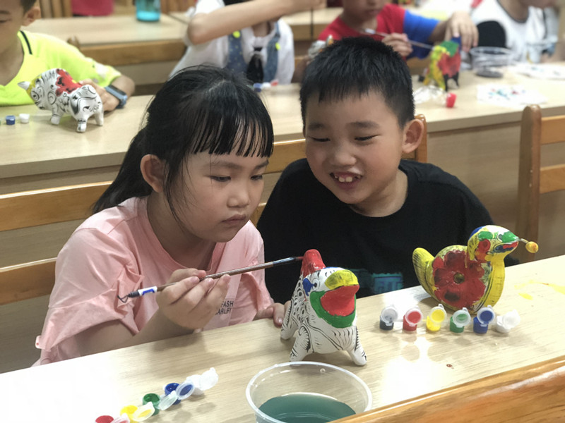 在泥塑彩绘主题课上,老师通过展示、图片赏析、现场讲解等方式为孩子们简单讲述了在民间有祈福、辟邪作用泥塑的起源及发展历史、分类、工艺特色,在普及泥塑、彩绘的基本知识和技巧后,老师带领着孩子们开始十二生肖泥塑彩绘了。在掌握了从颜色的搭配以及十二生肖泥塑特征,到画笔与颜料、水之间的灵活运用后,孩子们迫不及待的纷纷拿起手中画笔,在泥塑上描绘绚丽的色彩,有的孩子绘画技艺精湛,红绿交错间,小小的生肖泥塑就像活了一样,生动活泼,惟妙惟肖;有的孩子不遵循传统生肖泥塑的着色技巧,用自己的巧思妙想把泥塑刻画得更加新颖、时尚,让人眼前一亮……