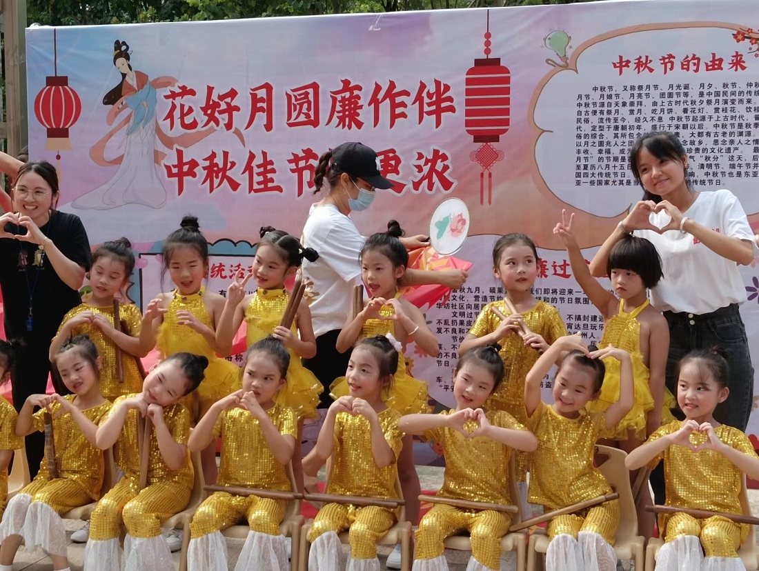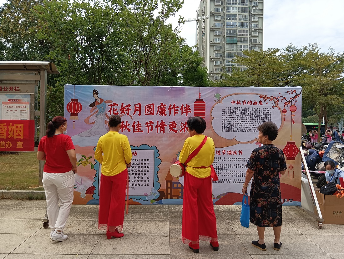 “中秋节,又称祭月节……”在展板前观看的李阿姨和徐阿姨一边指着板报一边小声交流着,这些传统文化知识还吸引了幼儿园的小朋友驻足观看。
