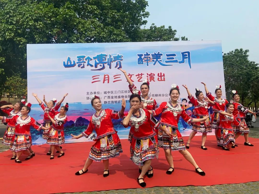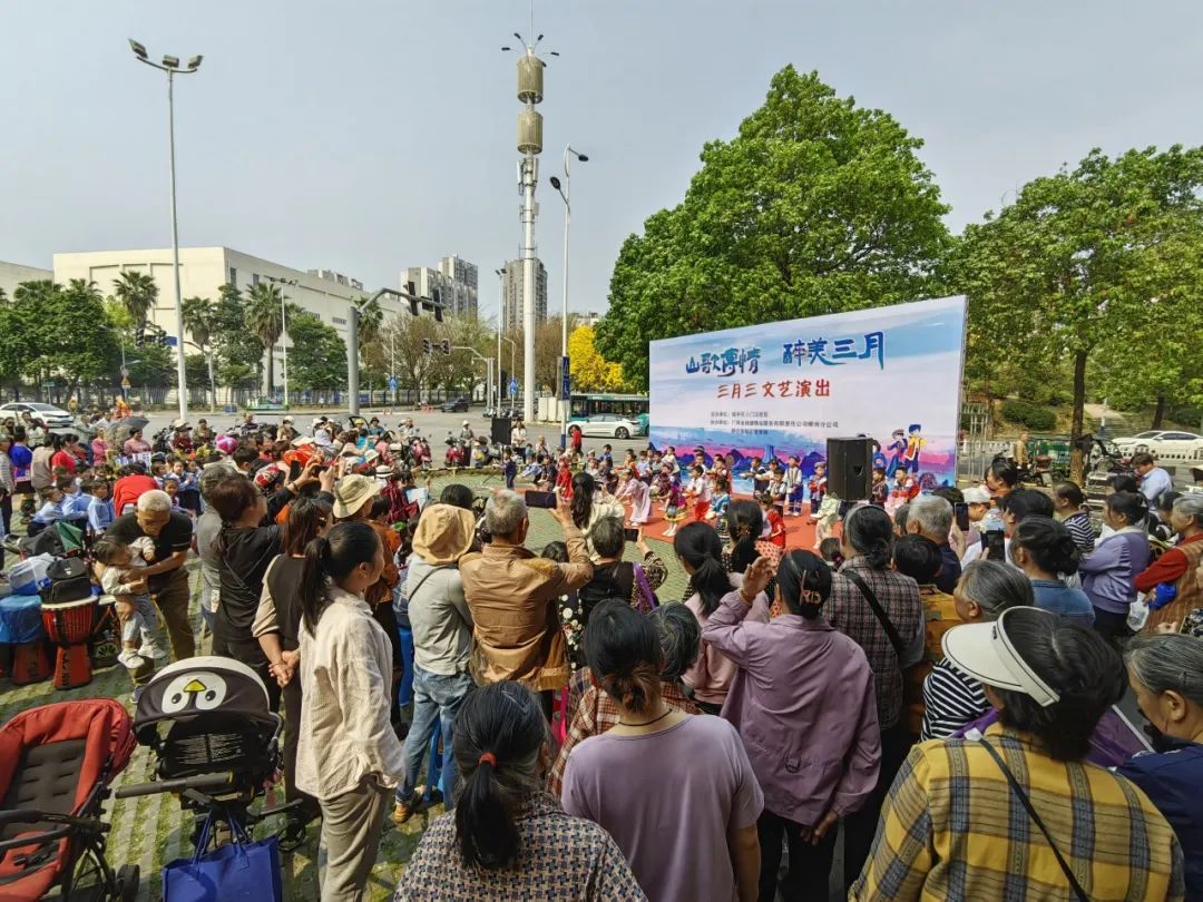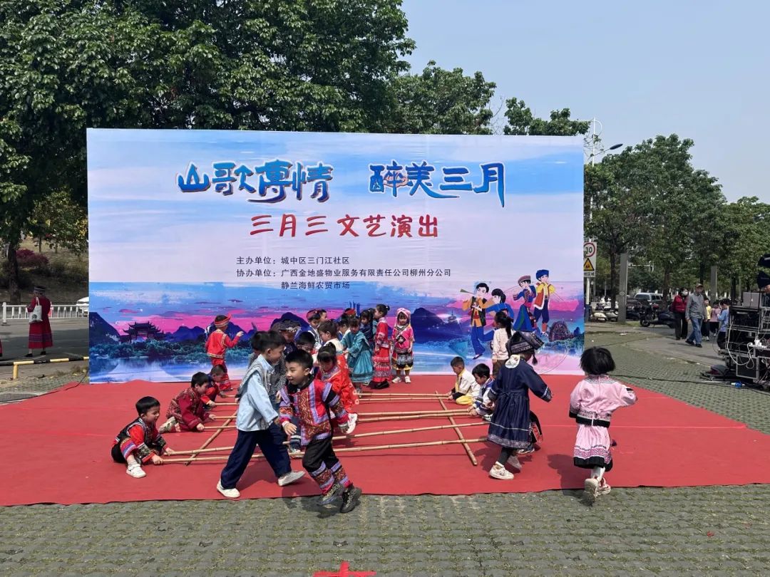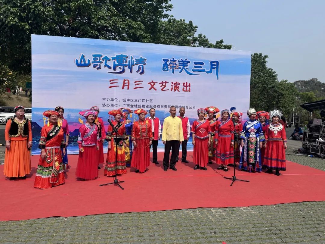 3月26日上午,三门江社区在辖区大都沁园静兰海鲜农贸市场门前成功举办了 “山歌传情,醉美三月” 三月三文艺汇演,此次活动吸引了众多辖区居民热情参与,现场洋溢着浓郁的民族文化氛围。