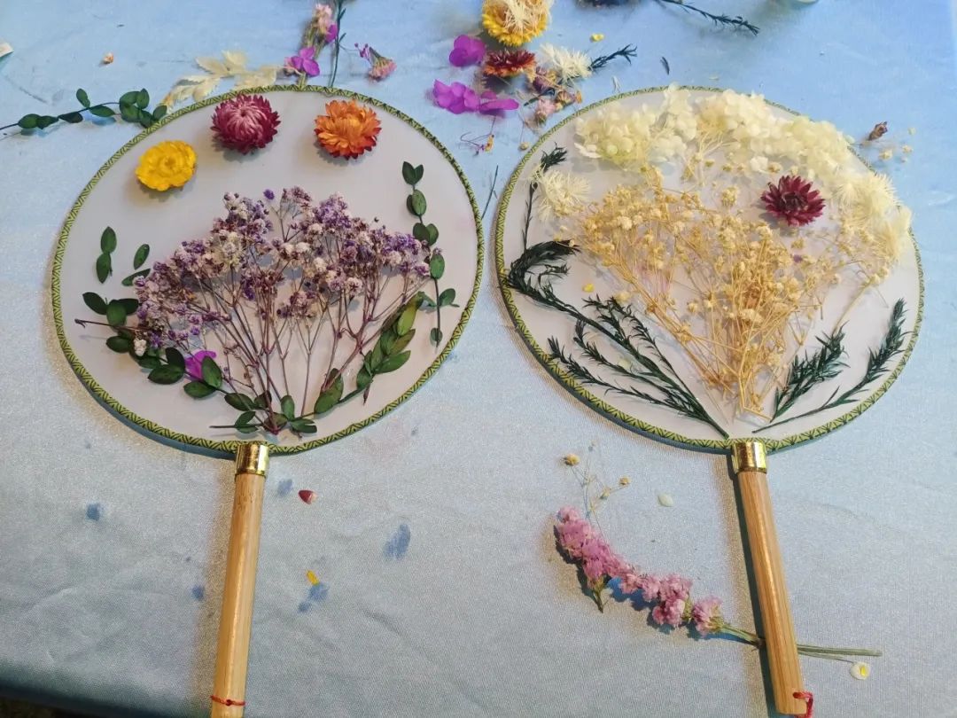 制作干花扇子活动现场摆满了各式各样的干花和精美的扇子,妈妈们充分发挥自己的创意和想象力,将干花巧妙地粘贴在扇子上,制作出独一无二的干花扇子。一把把扇子不仅承载着母亲们对美的追求,更寄托了她们对美好生活的向往。