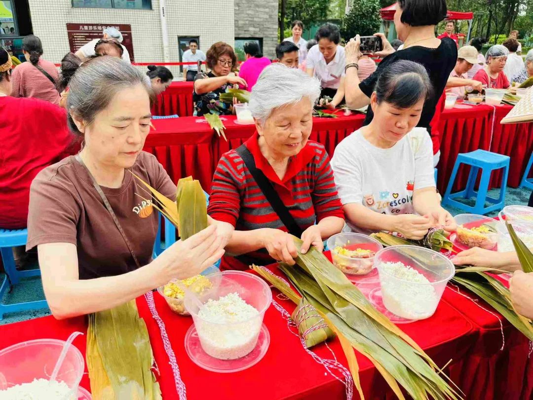 除了精彩的文艺演出,社区还为居民们准备了包粽子的材料,邀请大家一起动手包粽子。大家围坐在一起,互相交流包粽子的技巧,纷纷拿出自己的看家本领,捋粽叶、填糯米、放馅料、扎粽绳,动作娴熟,一气呵成。不一会儿,一个个饱满紧实、形状各异的粽子便摆满了桌面。大家一边包粽子,一边分享着各自家乡的端午节习俗和美食,在交流互动中,进一步加深了对不同民族文化的了解和认识。