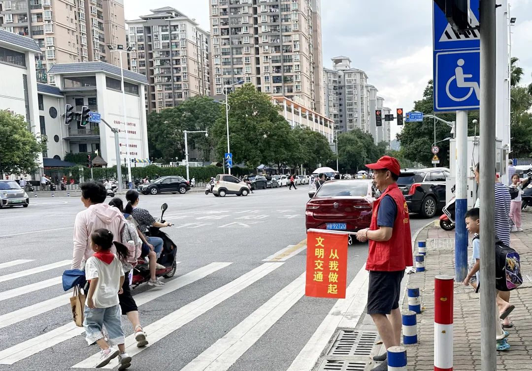 每周周五放学时段,民族实验小学校园周边总能看到这样一道风景:身着红马甲、手持指挥旗的银发志愿者们,在车水马龙中有序引导交通。他们的领头人覃云方,胸前佩戴的党员徽章在阳光下熠熠生辉。这位64岁的退休党员总是第一个到岗,用规范的手势疏导车辆,用温暖的笑容护送学生。“请稍等”“注意安全”的叮咛声,伴随着孩子们“谢谢爷爷”的回应,构成了最动人的城市交响曲。