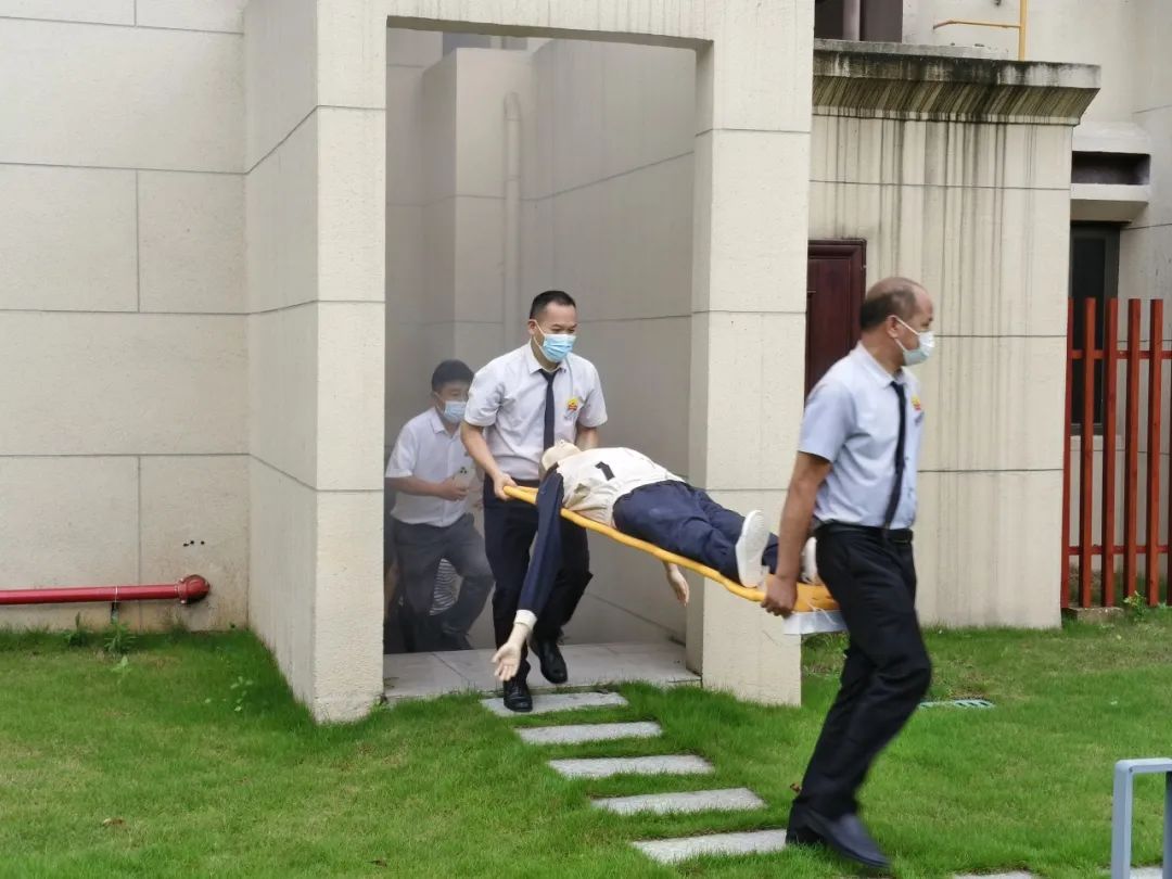 演练现场,模拟场景设定为小区地下车库因有火情发生,有人员被困并伴有浓烟产生,需要救援,物业工作人员及社区志愿者立即赶赴现场,组织被困人员有序疏散,合力将无法行动的被困人员通过担架抬出车库,顺利完成救援行动。