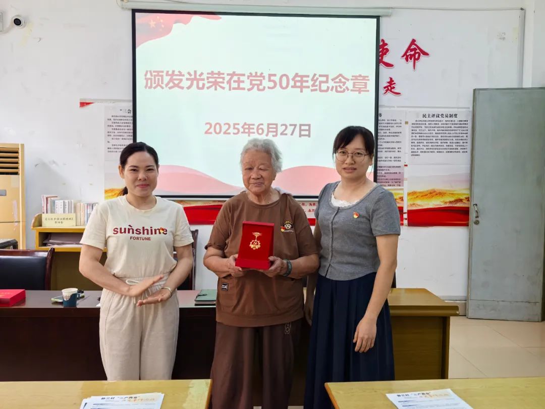 宣誓仪式后,党总支书记李丹丹与副书记莫海芳共同为老党员梁美光颁发“光荣在党50年”纪念章。现场热烈的掌声是对老党员梁美光多年来坚守初心、默默奉献一生的崇高褒奖,这枚熠熠生辉的纪念章也是激励年轻党员传承红色基因,接续奋斗的精神火炬。随后,宣讲员以《柳州解放思想、创新求变,向海图强、开放发展的生动实践》为题,为党员们带来了一场主题鲜明,易于理解的宣讲,通过具体案例,引导大家将学习成果转化为推动乡村发展的实际行动。