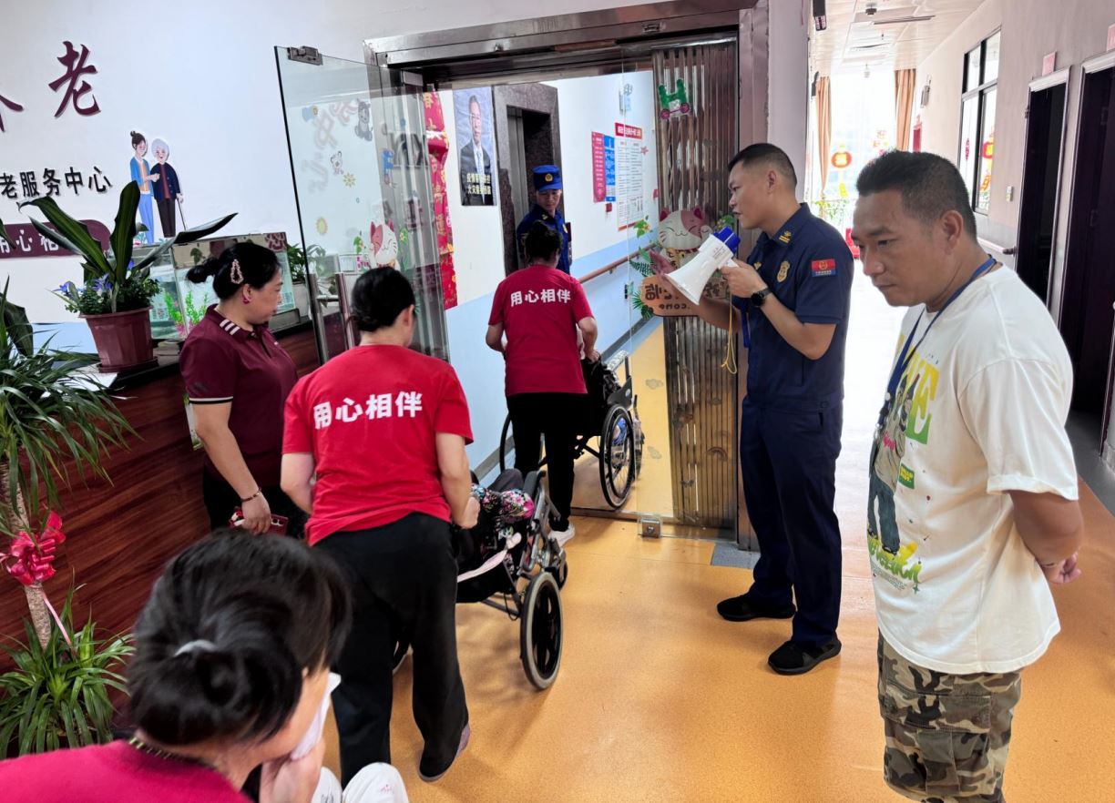 在理论讲解环节,消防员通过真实案例向居民讲解火灾危害性,重点介绍了家庭防火注意事项、初期火灾扑救方法及火场逃生技巧。针对养老中心特殊群体,消防员特别演示了轮椅逃生等实用技能。