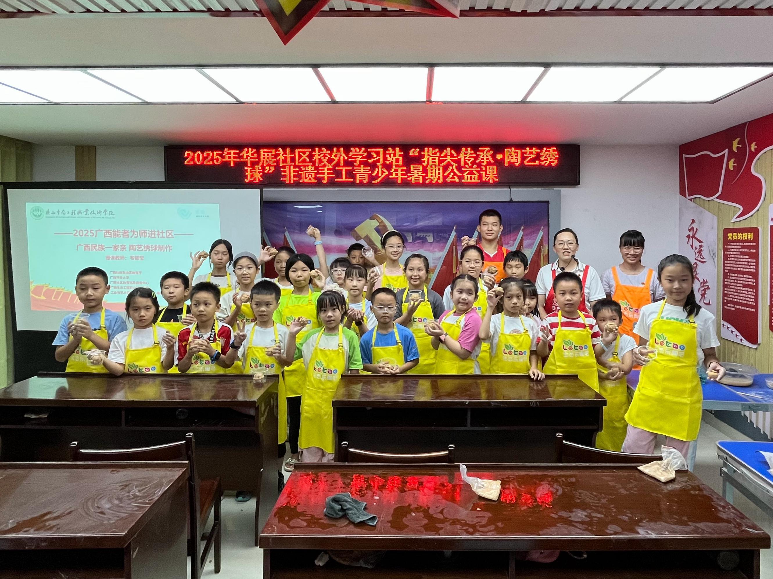 为弘扬中华优秀传统文化,丰富辖区未成年人暑期生活,8月19日上午,华展社区校外学习站联合广西生态职院开展“指尖传承•陶艺绣球”非遗手工公益课活动。孩子们在专业老师的指导下,亲手制作陶艺绣球,近距离体验非遗技艺的独特魅力,感悟中华传统匠人精神。
