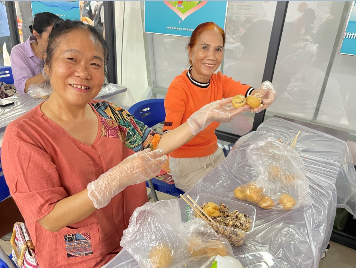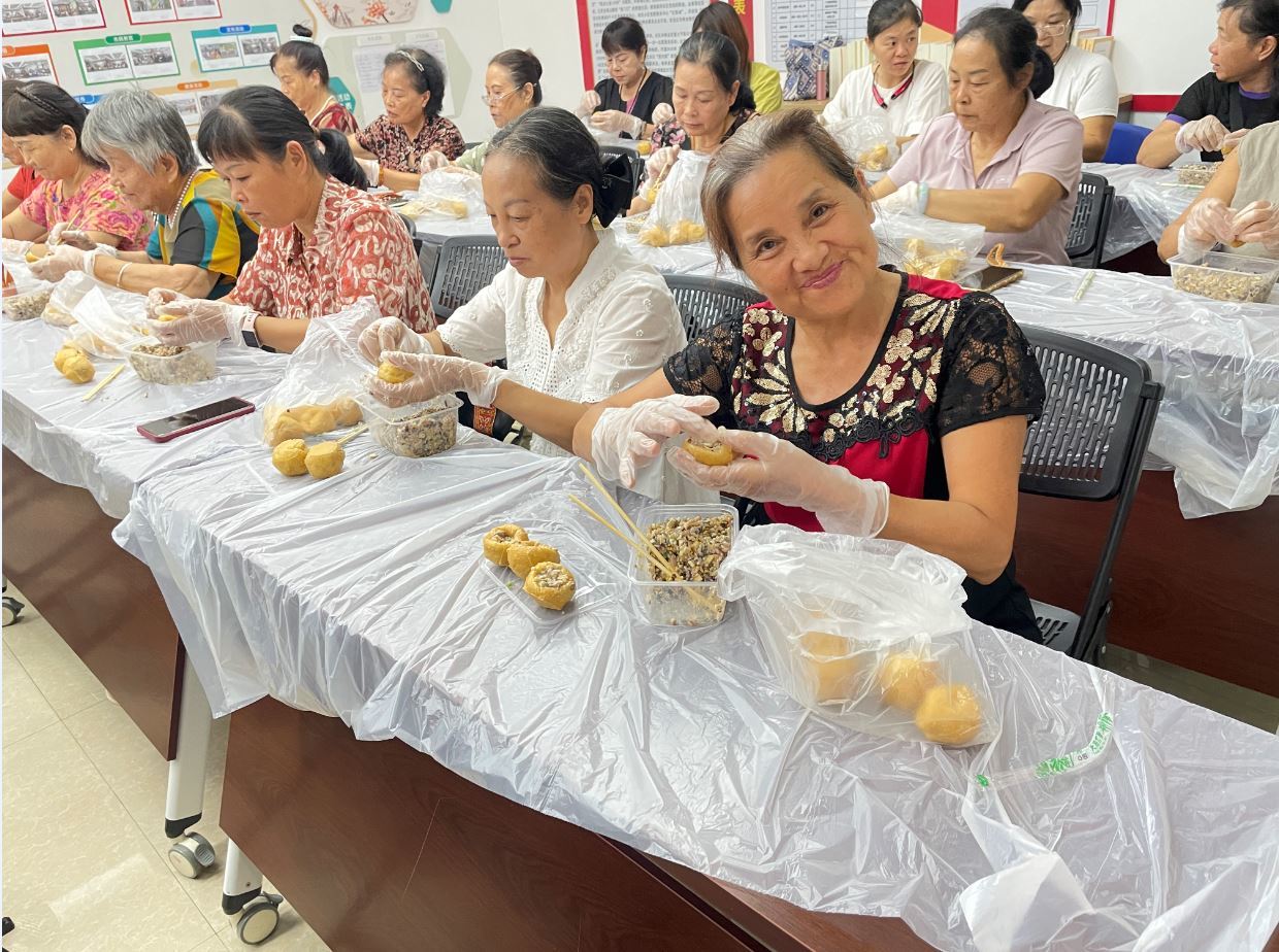 活动最后,“民族特色豆腐酿制作”环节热闹开启。居民们围坐在一起,拿出“十八般武艺”,揉馅、填馅、塑形,互相交流技巧,分享制作心得。不一会儿,一个个形态饱满的豆腐酿新鲜出炉,活动室里弥漫着美食的香气,也充满了居民们开心喜悦的话语,大家在协作中拉近了距离,在分享中传递了温暖。