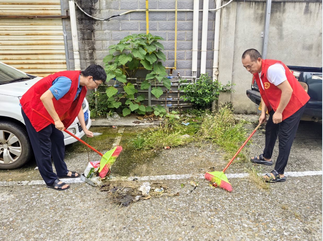 活动伊始,潭东社区党委书记赖慧根据任务分工,将35名参与人员划分为三个行动小组,分别负责楼道清扫、路面清理及积水排查处理。楼道清扫组携带扫帚、拖把、垃圾袋等工具,逐栋逐层清理楼道内的积尘、杂物,改善了楼道卫生状况;路面清理组重点对小区主次干道、停车场的落叶、烟头、白色垃圾进行全面清扫,不放过任何卫生死角,让小区路面焕然一新;积水排查处理组则深入小区各个角落,开展“翻盆倒罐”行动,仔细排查花盆托盘、下水道口、闲置容器等易积水区域,及时清空积水、清理杂物,从源头减少蚊虫孳生环境,为居民健康保驾护航。