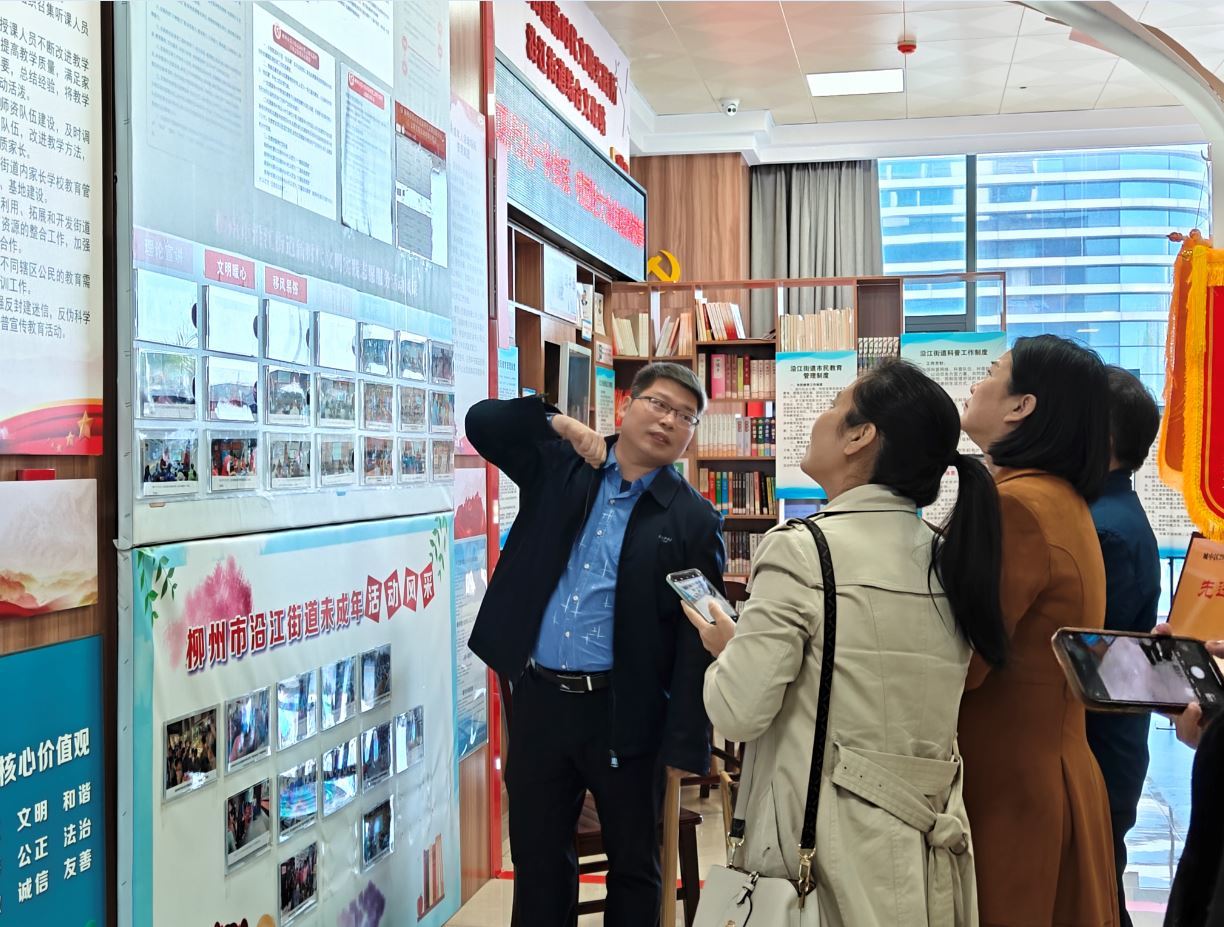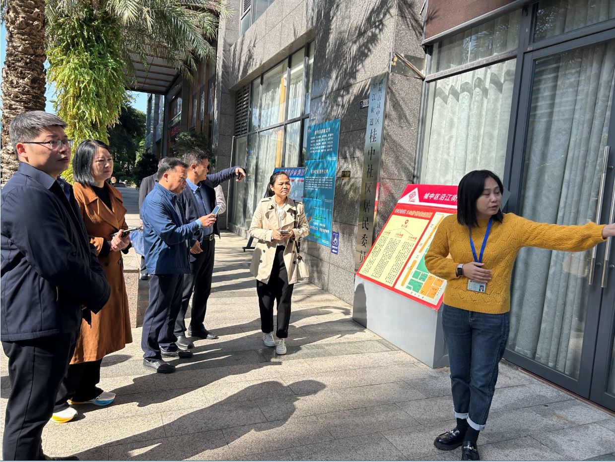 在沿江街道桂中社区,考察团实地考察了社区新时代文明实践站及活动场所多功能使用模式。社区党委书记李晓荣重点讲解了社区通过制度创新和资源整合提升服务效能的做法,如优化志愿服务机制、强化居民参与等,为考察团介绍了基层治理经验。