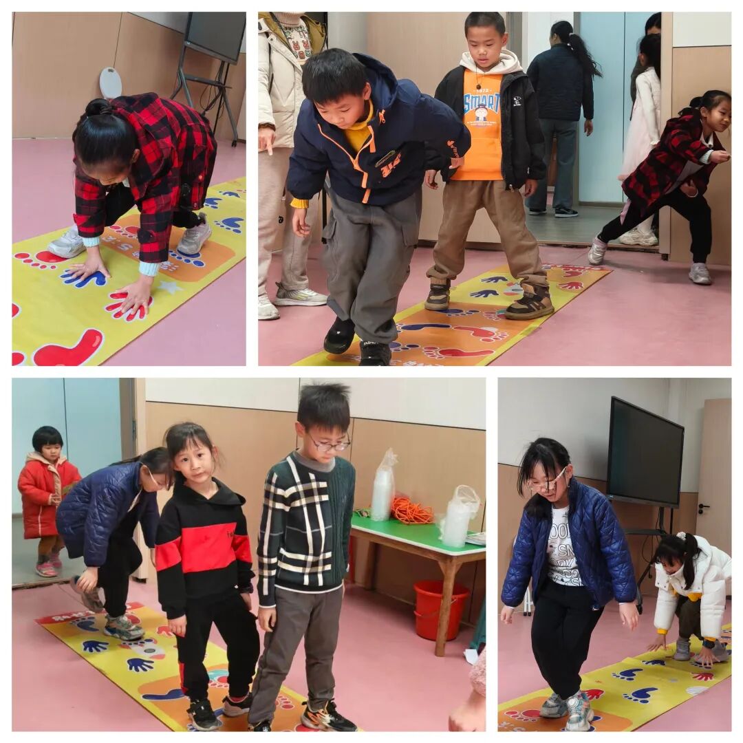 在“词语配对”桌前,黄色卡片上的“成长”“学习”“小神童”等词语,让孩子们在快速匹配中锻炼了反应力和词汇量;在“速算挑战”区,孩子们低头疾书,在规定时间内完成数学题,比拼着专注力与计算能力;还有“手脚并用”的趣味垫游戏,孩子们按照垫子上的手印和脚印提示,手脚协调地完成动作,在欢声笑语中提升了身体协调性。