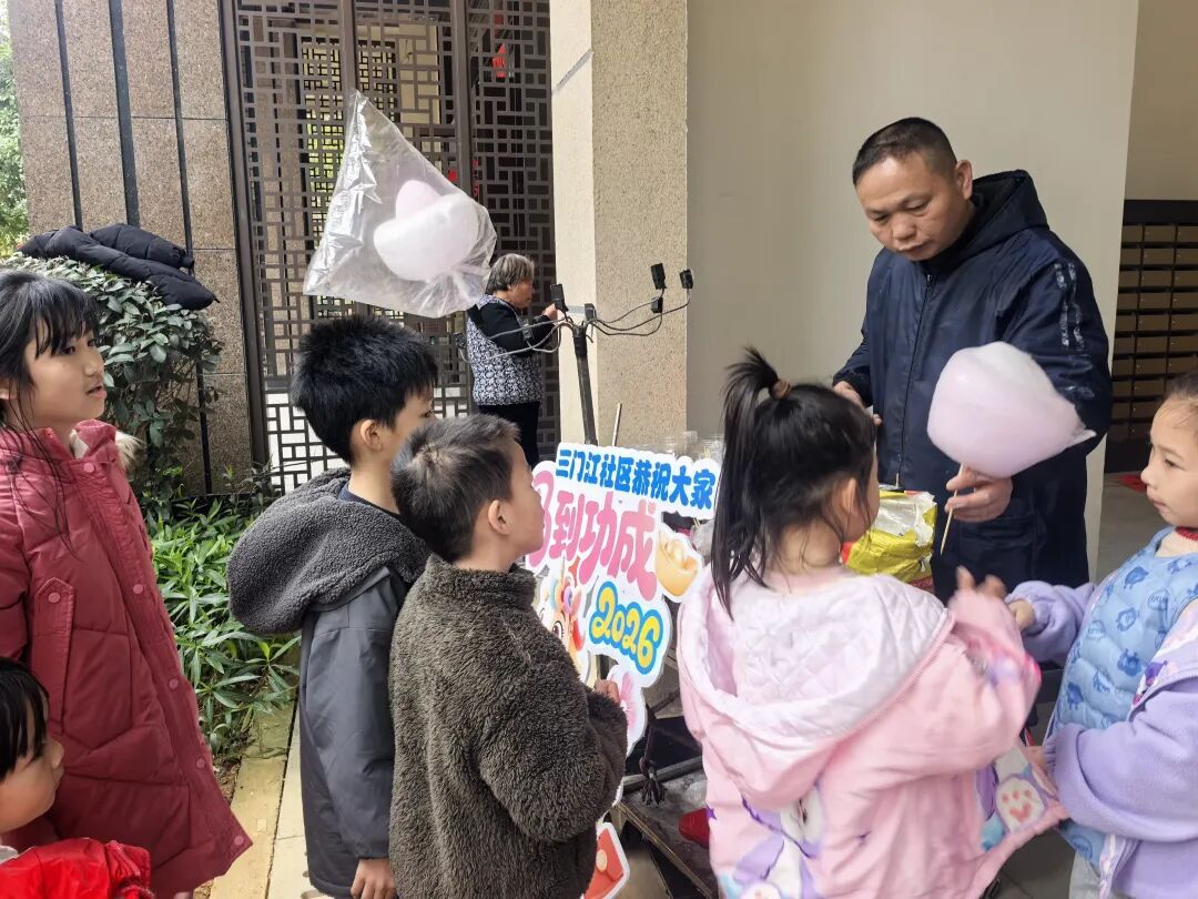 活动现场年味浓郁,“三门江社区恭祝大家2026新年快乐”的红色展板格外醒目,奔腾的骏马图案寓意着马到成功的美好期许,处处洋溢着祥和热闹的节日气息。活动现场不仅为居民备齐空白红联、毛笔、墨水等创作材料,更精心打造暖心便民服务角,现场熬制银耳羹、制作棉花糖、准备冰糖葫芦,让居民在翰墨飘香中,收获舌尖上的甜蜜与冬日暖意。