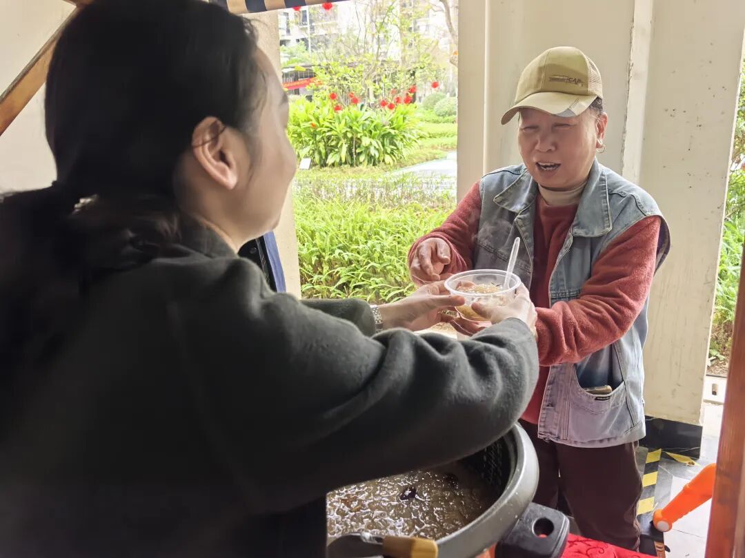 活动间隙,暖心服务角前人头攒动。棉花糖、冰糖葫芦整齐摆放,工作人员贴心地将热气腾腾的银耳羹递到居民掌心。香甜滋味在舌尖蔓延,温暖触感直达心底,邻里情谊悄然流淌。大家一边品尝小食,一边畅谈书法技巧、分享新春心愿,或驻足欣赏他人作品,或展示自己的创作,欢声笑语萦绕耳畔,整个小区都浸润在浓年味与邻里温情中。